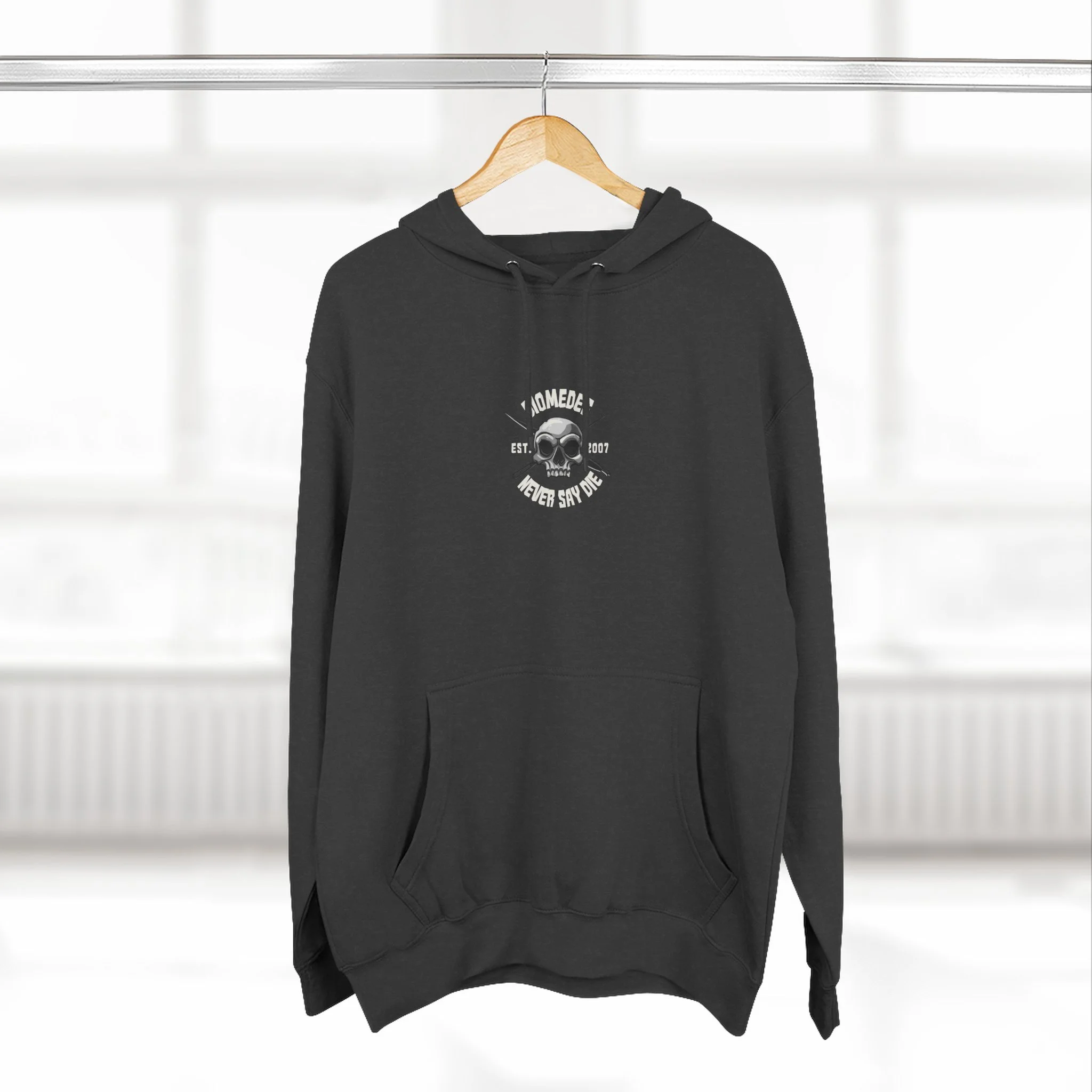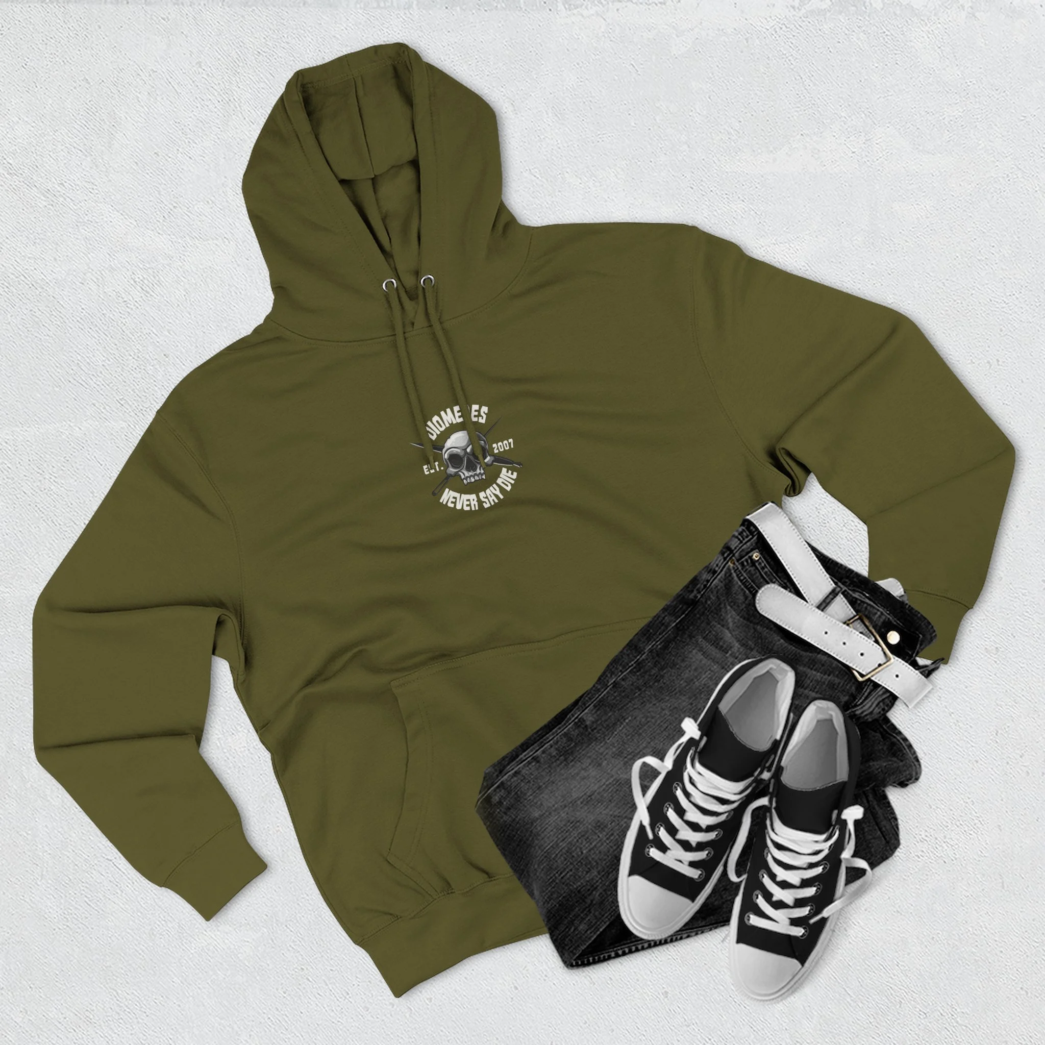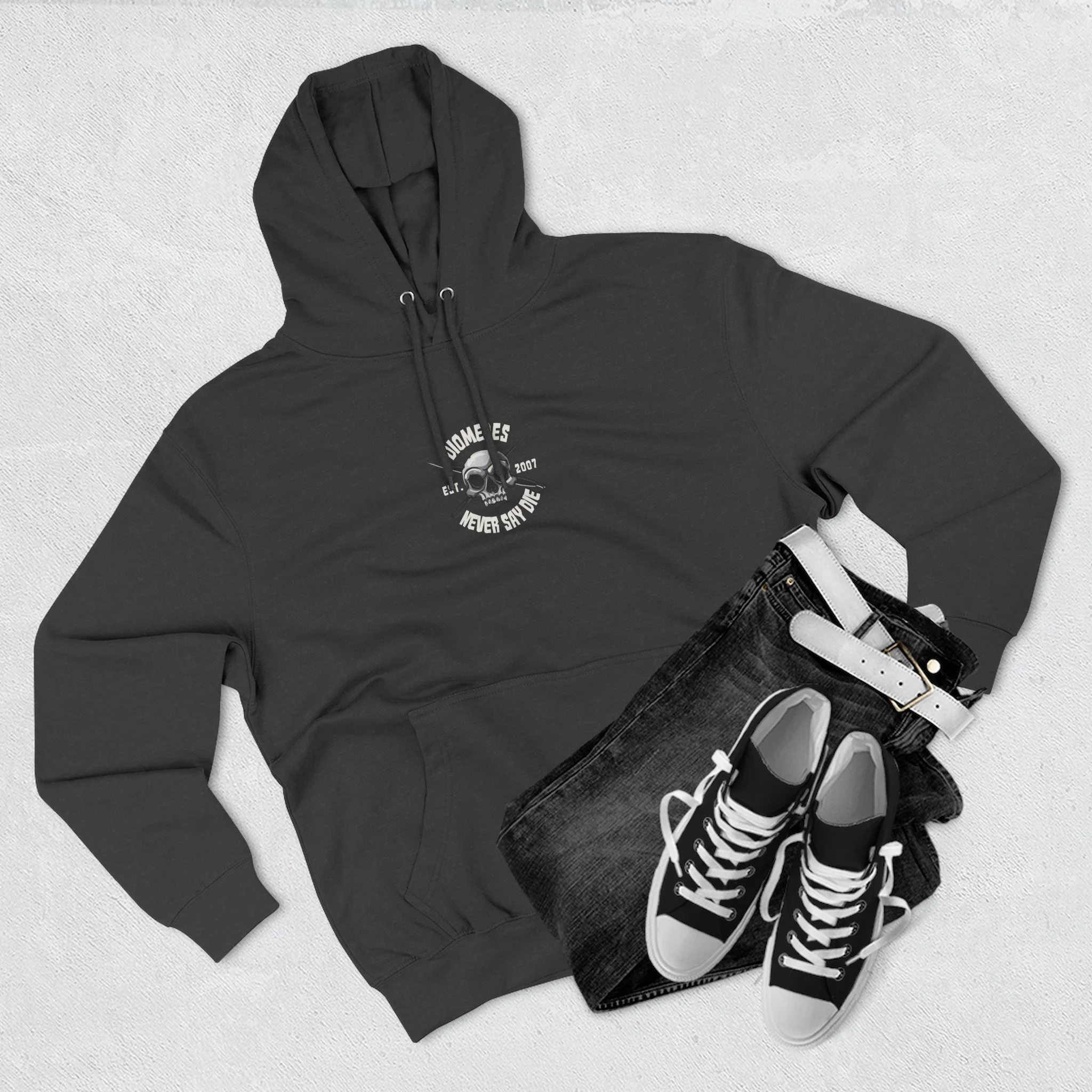 "Never Say Die" Fleece Hoodie — White Letters