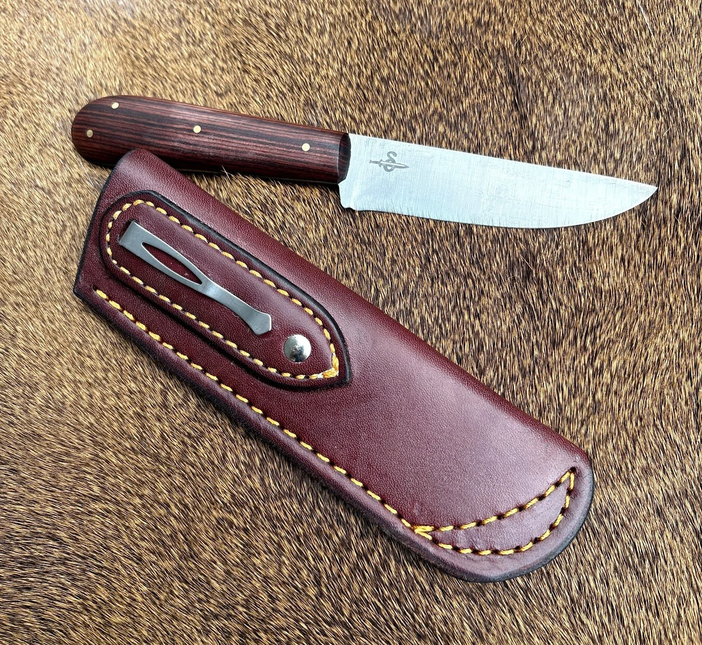Every Kontos comes with a sheath crafted in the same spirit as the knife it carries—rugged, purposeful, and made to last. Hand-cut and hand-stitched from 8–10 oz vegetable-tanned leather, the butterfly-style sheath is stitched with ultra-durable Ritza 25 thread and built for secure, accessible carry. Choose from classic black or a bold dragon-scale stamped pattern—each one made by hand, each one made to ride with you through years of use. Whether worn on the belt or tossed into a rucksack, it protects your edge and honors your craft.