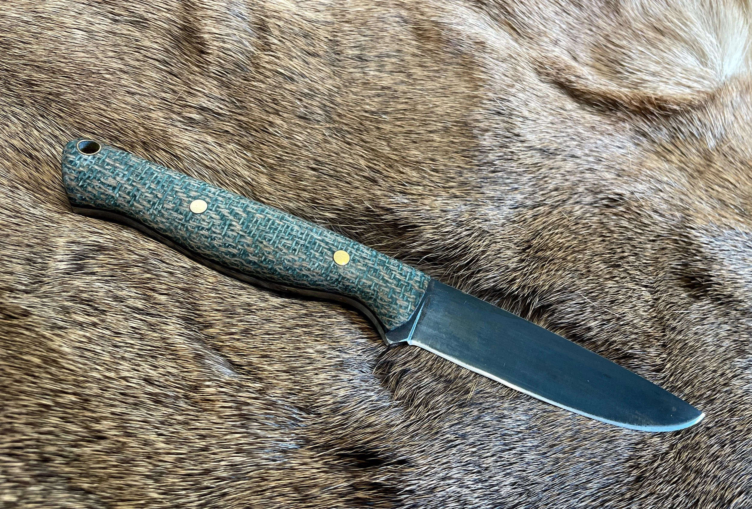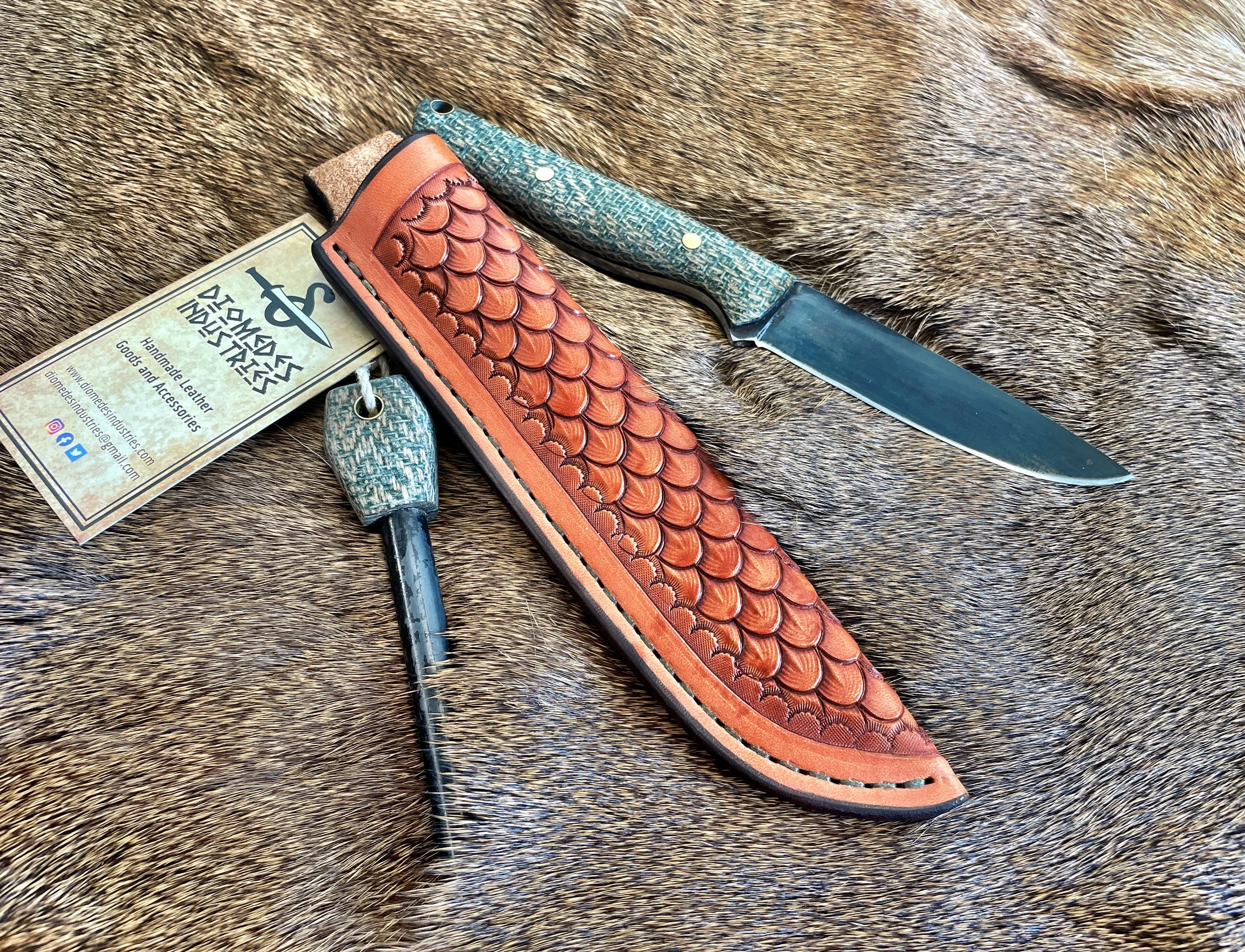 Categories: All Knives Sheaths All / 51 Bravo Fighting Bowie Knife and Diomedes Sheath Gunny Homage Knife 51 Bravo Bird and Trout in San Mai with Custom Sheath Sold Out